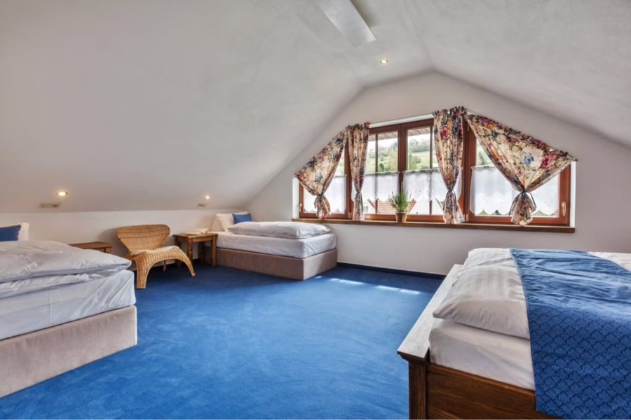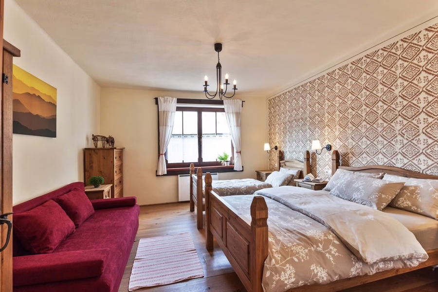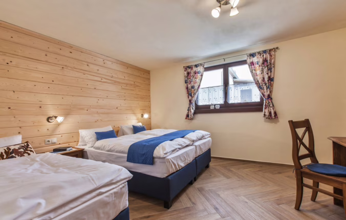 Útulná izba vhodná pre rodinu s malými deťmi, ktorá rada spí pokope. Postele je možné jednoducho presúvať.