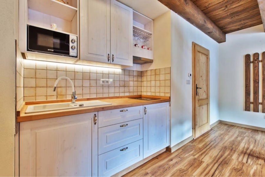 Nájdeme tu plne vybavenú kuchynku - 2 platnička, drez, malá chladnička, kanvica, vybavenie pre základné stolovanie a poháre pre 4 osoby, hrnce, panvica, nože, vývrtka na víno.